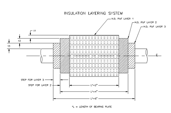 A solution that eliminates this potential problem is providing multiple mating surfaces between the line insulation and the pipe support. Hence: When insulation thickness is four inches and greater, multiple layers provide an improved moisture seal due to steps between the different layers.
